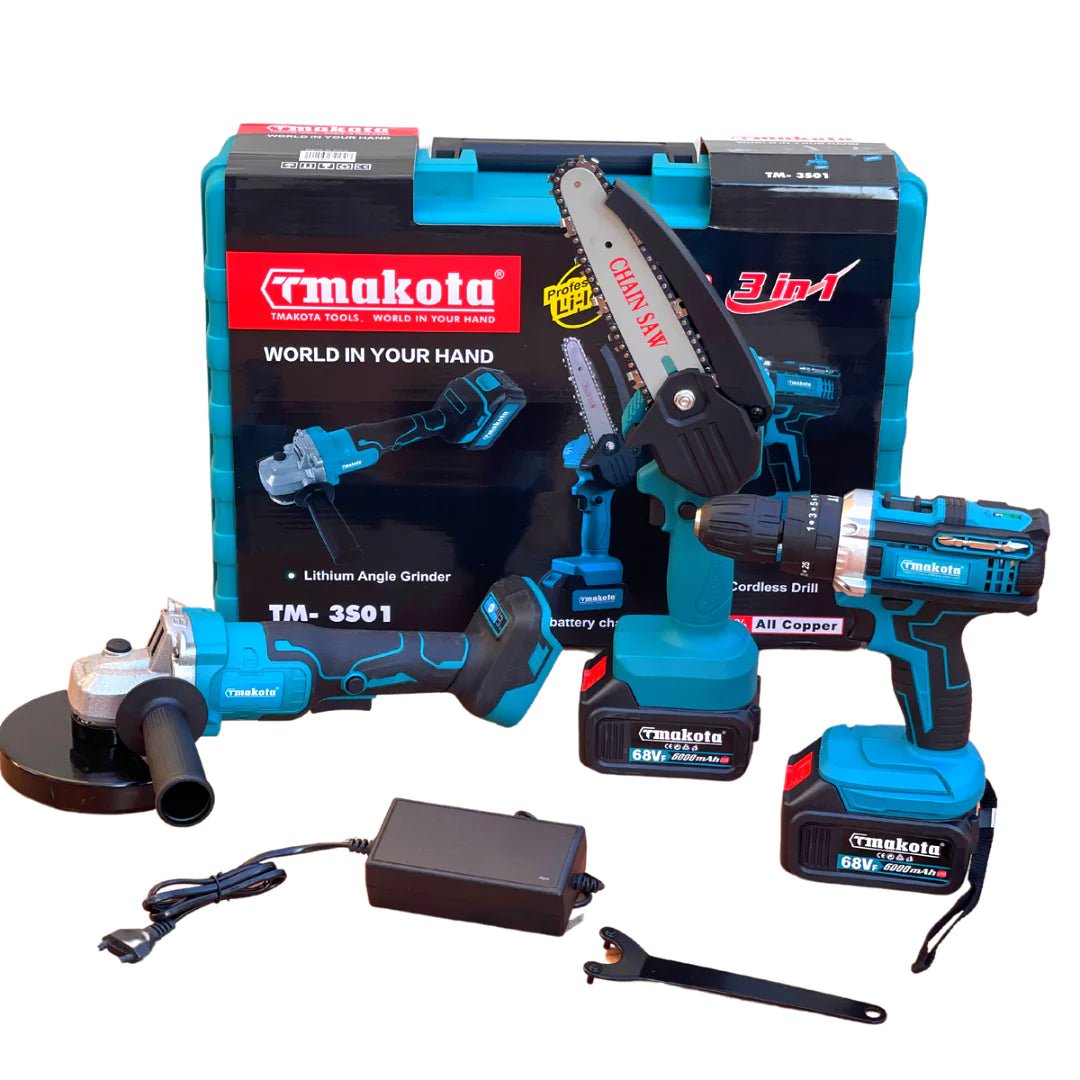 Flex / Smerigliatrice + Trapano Avvitatore a Percussione + Mini Motosega Kit 3 in 1 a Doppia Batteria 68V