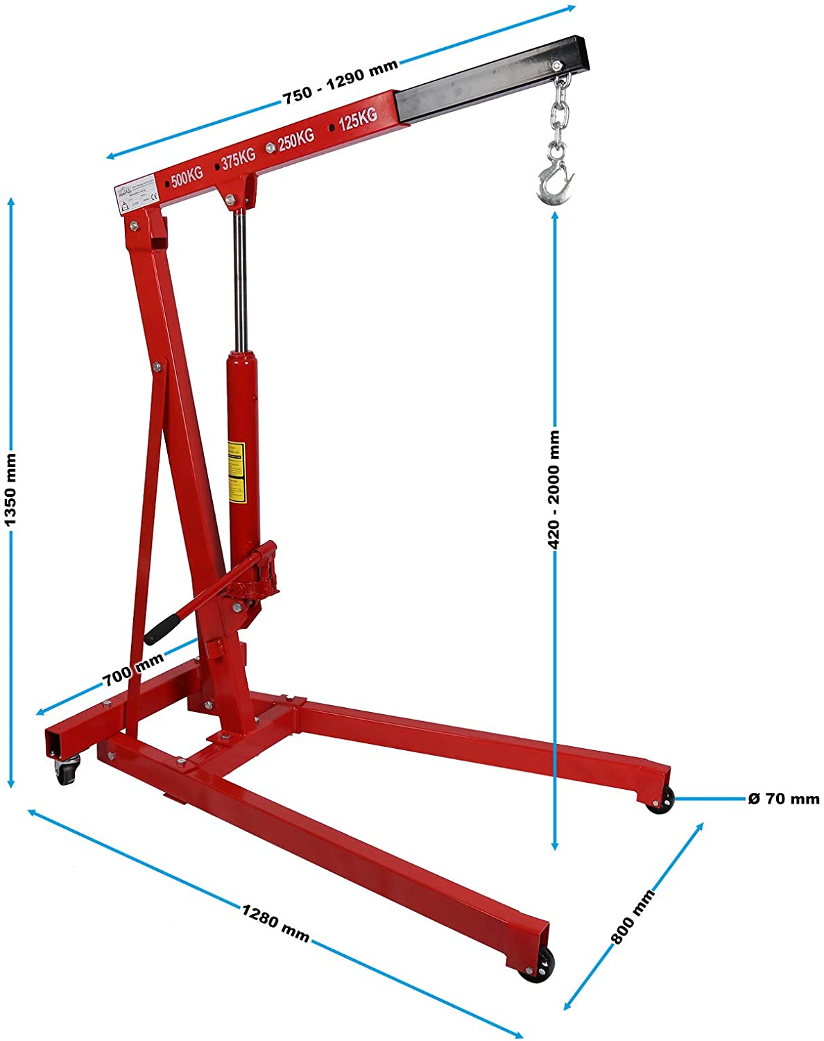 Gru gruetta idraulica da officina fino a 500 kg braccio di sollevamento 750-1290 mm