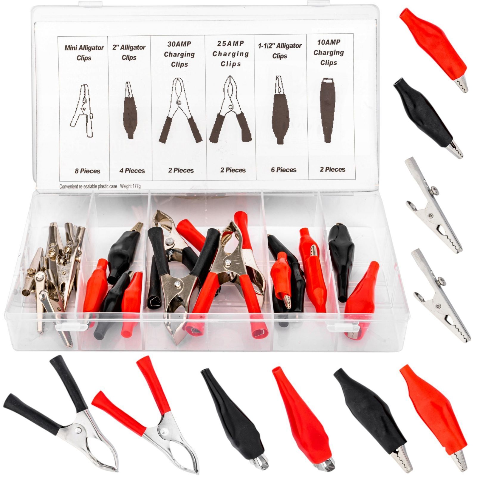 Kit 24 Morsetti Alligatore Assortimento Mollette Coccodrillo 6 dimensioniSet di Morsetti Alligatore - 24 Pezzi in 6 Dimensioni DifferentiQuesto set di morsetti alligatore include 24 pezzi in 6 diverse dimensioni, pensato per offrire soluzioni versatili e pratiche per una varietà di applicazioni elettriche. Ogni morsetto è progettato per una presa sicura e una connessione stabile, ideale per progetti di saldatura, test elettrici, riparazioni e altro ancora. Il set è fornito in una pratica confezione plastica richiudibile che permette di organizzare i morsetti in modo ordinato e trasportarli facilmente.Dettagli del Set:Mini Morsetti Alligatore (8 pezzi) – Morsetti compatti e facili da usare, ideali per connessioni leggere e per lavorare su componenti piccoli.Morsetti Alligatore da 2" (4 pezzi) – Morsetti di dimensioni standard, perfetti per applicazioni quotidiane, con una buona capacità di presa e isolamento.Morsetti da 30A (2 pezzi) – Morsetti per alta capacità di corrente, progettati per cariche fino a 30 ampere, ideali per applicazioni di ricarica e alimentazione.Morsetti da 25A (2 pezzi) – Morsetti da 25 ampere, adatti per carichi di corrente medi, offrendo una connessione sicura per impieghi elettrici.Morsetti Alligatore da 1-1/2" (2 pezzi) – Morsetti con una presa ampia, utili per una varietà di situazioni che richiedono una superficie di contatto maggiore.Morsetti da 10A (2 pezzi) – Morsetti compatti da 10 ampere, ideali per progetti di bassa intensità, come test di circuiti o applicazioni leggere.Caratteristiche principali:Varietà di dimensioni: Il set comprende 6 diverse dimensioni di morsetti alligatore, ognuna progettata per un'applicazione specifica, che ti permette di scegliere il morsetto ideale per ogni tipo di progetto elettrico, che si tratti di test, riparazioni o connessioni temporanee.Materiale resistente e sicuro: Ogni morsetto è realizzato con materiali di alta qualità per garantire una lunga durata e una connessione stabile. I morsetti sono progettati per resistere a elevate temperature e per essere utilizzati in modo sicuro, evitando cortocircuiti o surriscaldamenti.Praticità di utilizzo: Ogni morsetto è dotato di una presa ergonomica e facile da maneggiare, che consente di applicare la giusta pressione sulle superfici di connessione senza sforzi. Sono perfetti per lavori che richiedono un contatto rapido e sicuro.Facile organizzazione e trasporto: Il set è fornito in una pratica confezione plastica richiudibile, che ti consente di mantenere i morsetti ordinati, protetti dalla polvere e facilmente accessibili. Questo rende il set ideale per essere portato in cantiere, laboratorio o ovunque sia necessario.Versatilità per molte applicazioni: Che tu stia lavorando su circuiti elettronici, batterie, test di tensione o altre applicazioni elettriche, questo set di morsetti alligatore ti offre una soluzione versatile, ideale per lavori di precisione e progetti fai-da-te.