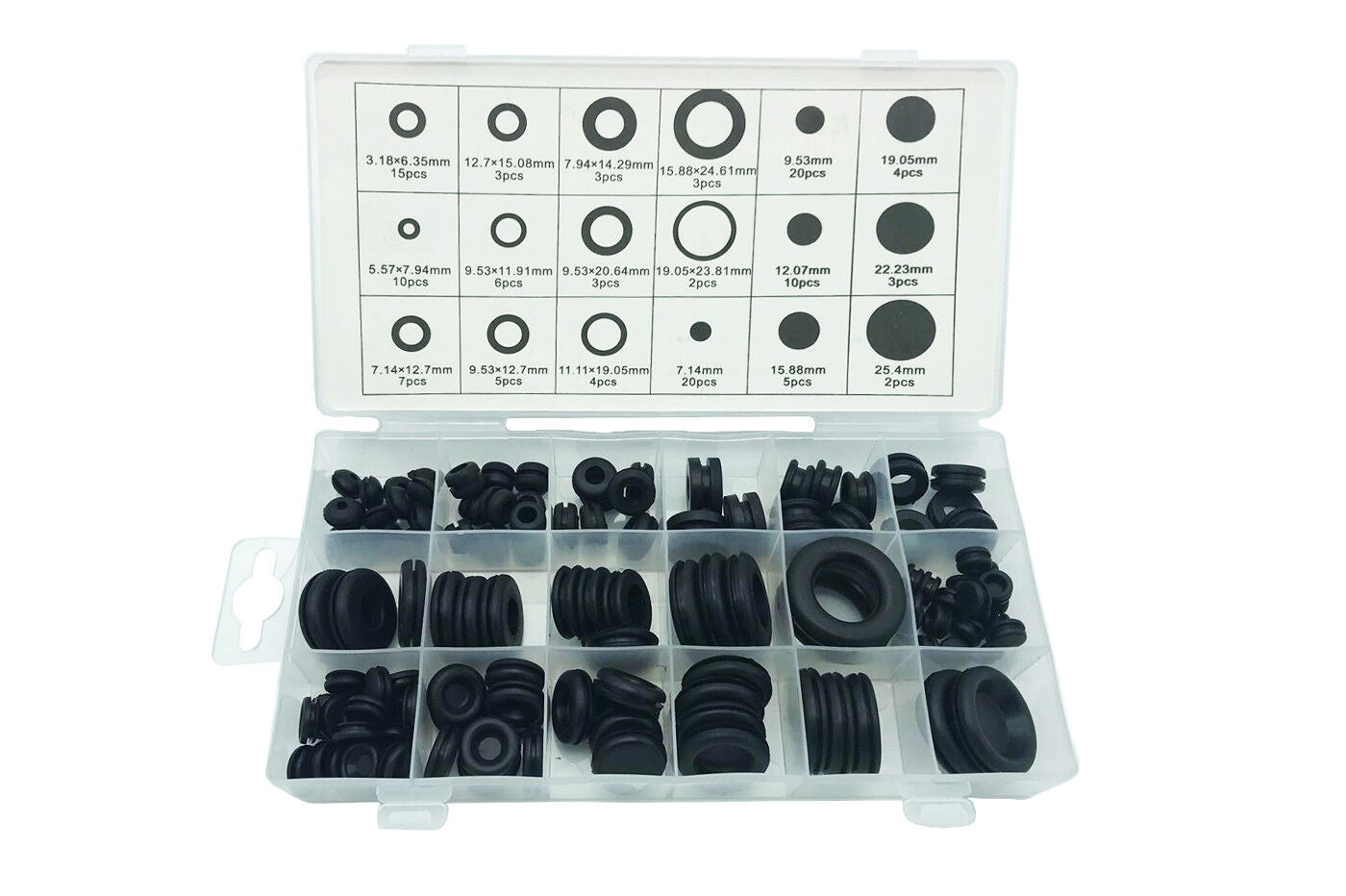 Guarnizioni in gomma assortiti anello di protezione bobina protettiva 125PZ Assortimento di 125 gommini di protezione in gomma di diversi diametri. Ideale per pressacavi o condotti in recinti. I gommini sono contenuti in un comodo contenitore in plastica trasparente.Caratteristiche tecniche:Guarnizione in gommaColore: nero125 pezziMisure: 3.18x6.35mm, 12.7x15.08mm, 7.94x14.29mm, 15.88x24.61mm, 9.53mm, 19.05mm, 5.57x7.94mm, 9.53x11.91mm, 9.53x20.64mm, 19.05x23.81mm, 12.07mm, 22.23mm, 7.14x12.7mm, 9.53x12.7mm, 11.11x19.05mm, 7.14mm, 15.88mm, 25.4mmDimensioni confezione: l 21 cm x h 10.5 cm x a 3 cm circaPeso: 200 g circaLa confezione contiene:Nr. 125 Guarnizioni in gomma