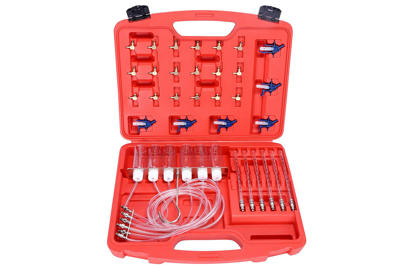 set di strumenti per misurare la quantità di carburante che gli iniettori restituiscono al serbatoio.Può essere usato per identificare iniettori danneggiati o intasati.Il kit può misurare fino a 6 iniettori contemporaneamente.Misura diretta del flusso di ritorno dell'iniettore.Misurazione del flusso di ritorno mediante un flussimetro esterno.Adattatori per iniettori 24 pezzi per iniettori BOSCH-01, SIEMENS-02, DENSO-03 e DELPHI.Contenuti:1) 6 x adattatore: per iniettori Bosch.2) 6 x adattatore: per iniettori Siemens.3) 6 x Adattatore: per iniettori Delphi.4) 6 x Adattatore: per iniettori Denso.5) 6 tubi trasparenti resistenti al carburante.6) 6 bottiglie graduate per serbatoio da utilizzare durante il funzionamento del motore (capacità di 105 ml).7) 6 tubi manometro graduati da utilizzare durante l'avviamento del motore (capacità di 95 ml).