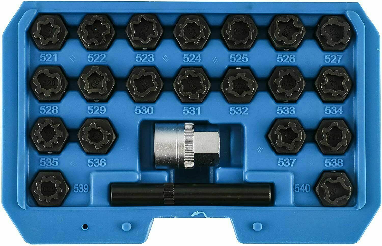 KIT CHIAVI RIMOZIONE RUOTA CERCHI IN LEGA ANTIFURTO La confezione include 20 chiavi speciali e un lungo adattatore quadrato da 1/2". L'adattatore è lungo 85 mm (31/2").Applicazione:veicoli tra cui AUDIForgiato a freddo e trattato termicamente consente una maggiore durata, prodotto in cromo molibdeno. Inclusa una resistente valigetta in plastica per un facile trasporto e conservazione.Tutte le parti sono OEM, equivalenti a OEM T10313. Utilizzato solo per garage o officina in buona fede.Il design a doppia testa consente il montaggio su chiavi a bussola.Forgiato a freddo e trattato termicamente consente una maggiore durata.Include più chiavi per adattarsi a una varietà di veicoli per gruppi.Indispensabile per qualsiasi garage o officina.Tutte le parti sono OEMLa confezione include:Set di strumenti di rimozione antifurto per blocco dado ruota 1x22 pezzi