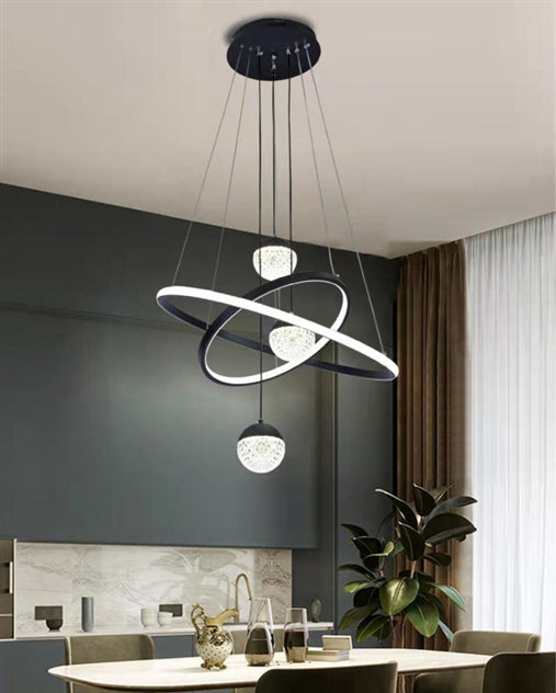 Potenza60W x2Tensione di funzionamento220-240v ACFrequenza50-60 HzTecnologiaLED SMD Lumen4800 lm x2 Materiali Alluminio ,Acrilico, Pvc,Base in MetalloCaratteristiche LedNon DimmerabileTemperatura luceTonalità di luce intercambiabile tra luce Fredda 6400K, Naturale 4200K e Calda 3000KMisure:Sfera100mm,diametro di cerchio 400*600mm ,Colore (finitura):Nero-Oro o Bianco