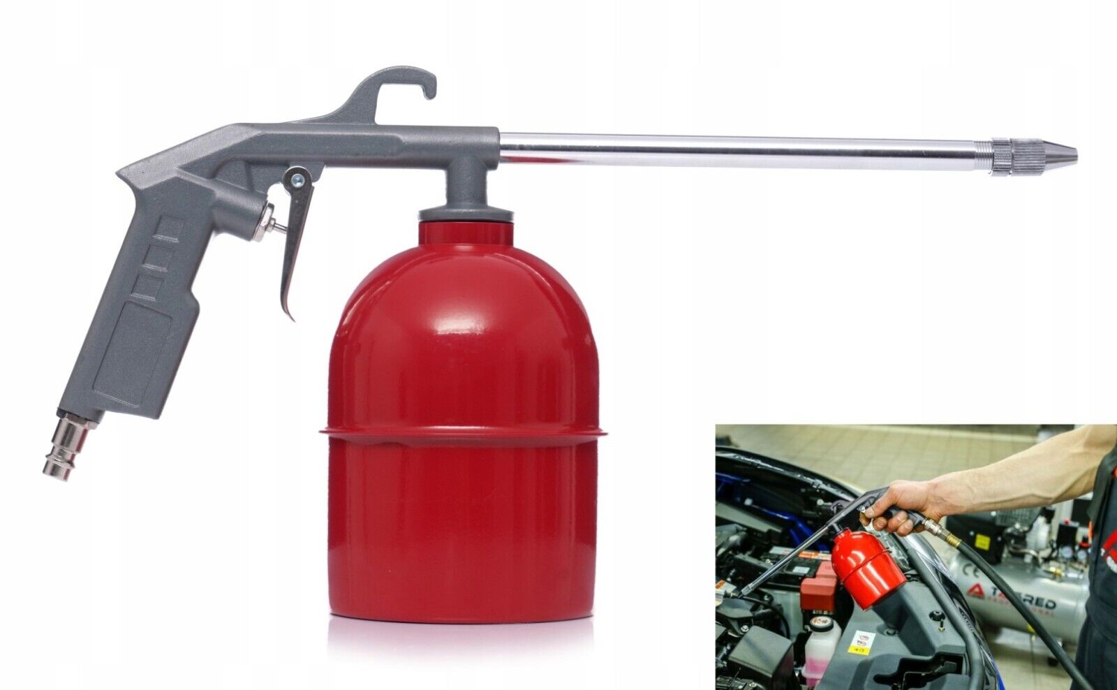 Pistola lavaggio aria compressa per compressore serbatoio 1L nafta olio gasolioPistola per lavaggio ad aria compressa con serbatoio da circa 1 litro.Lunghezza beccuccio: 24cm circa
