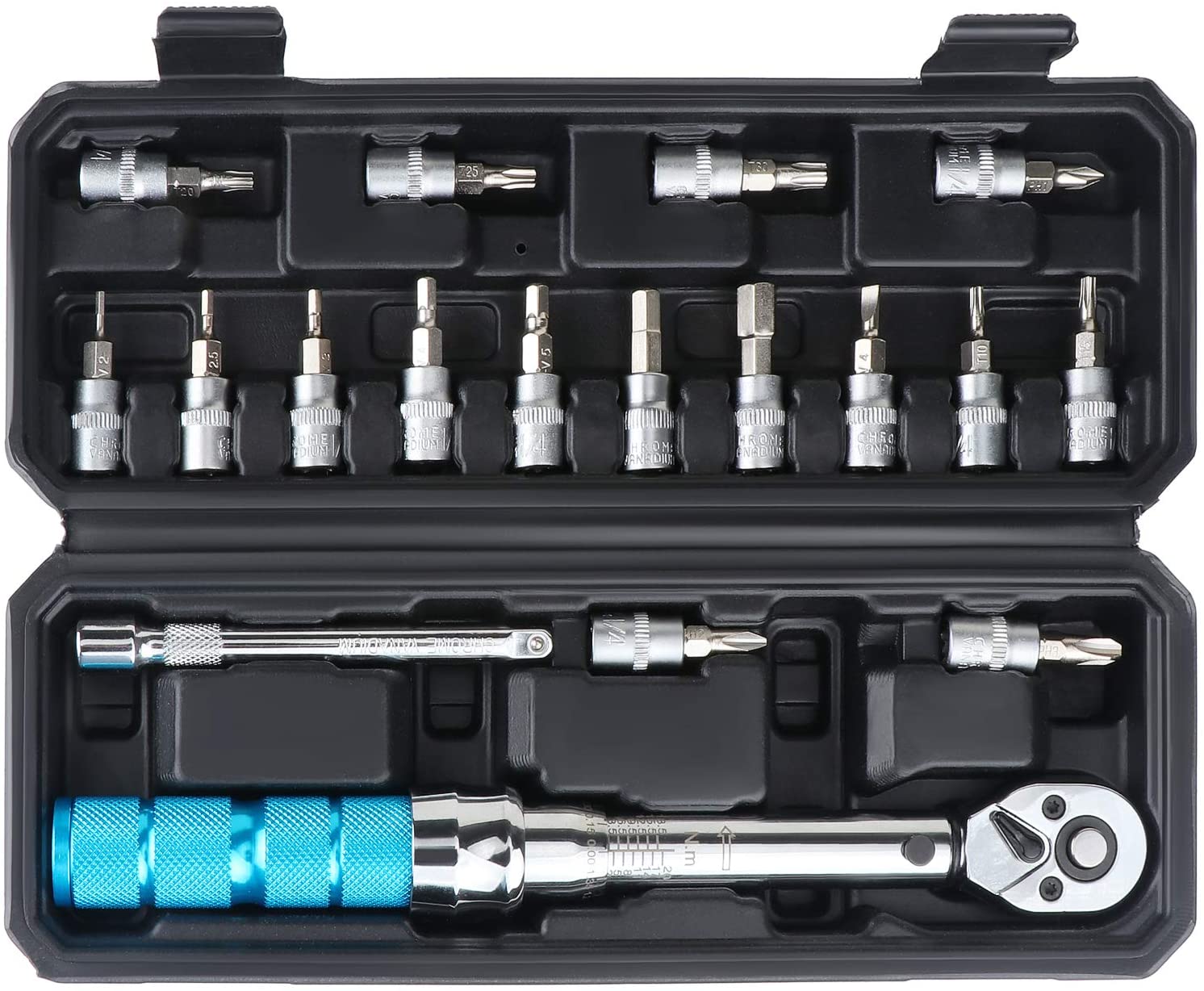 【Set di chiavi dinamometriche】: 1/4 di pollice aziona la gamma di impostazione di 2-20 Nm e le punte in dotazione includono esagono: H2, H2,5, H3, H4, H5, H6, H8. Torx: T10, T15, T20, T25, T30. Philips Bits: PH1, PH2, PH3.Slot Bits: barra di estensione 4mm e 50mm per raggiungere bulloni nascostiMateriale di alta qualità: acciaio al cromo vanadio con testa a cricchetto reversibile; finitura cromata lucida si pulisce facilmente e resiste alla ruggine e alla corrosione; maniglia di regolazione zigrinata e anello di bloccaggio per una regolazione precisa della coppia.Facile da usare: facile regolazione della coppia e design a sgancio rapido.✅【Nuova struttura】: scala a contrasto elevato e doppia gamma pre-calibrata a ± 4%. Include una robusta custodia in plastica per riporlo e portabilità.Ampia applicazione: una funzione di blocco/sblocco continente aiuta a mantenere i valori di coppia desiderati durante il serraggio dei bulloni. Gli indicatori di forza sulla chiave sono chiari e facili da leggere. Ideale per l'uso su steli, morsetti per sedili, morsetti a leva, guarniture, rotori e altro ancora.Descrizione prodottoChiave dinamometrica professionale 1/4" da 2 a 20 Nm ad alta precisione prefabbricata chiave dinamometrica regolabile per kit di riparazione bici moto Caratteristiche: ✔️ Design con fibbia: regolare la coppia più comoda, più risparmio energetico. ✔️ Scala chiara: più facile da leggere rispetto alle normali chiavi dinamometriche, migliora la precisione. ✔️ Manico di alta qualità: manico in alluminio antiscivolo, design zigrinato, efficace antiscivolo e antiruggine. Uso confortevole. ✔️ Clicca bidirezionale: la direzione di rotazione può essere regolata. La testa della chiave è dotata di pulsante di sgancio rapido, comodo e veloce per sostituire il manicotto. ✔️ Dotato di scatole per una comoda conservazione e trasporto. Le fessure sono utilizzate per prevenire danni o perdite di attaccamento. ✔️ Facile chiusura: tirare giù "anello di blocco" per sbloccare, aggiungere valore in senso orario, ridurre il valore in senso antiorario, rilasciare "anello di blocco" per bloccare il valore, funzionamento semplice. Specifiche: Gamma di coppia: 2-20 Nm. Tolleranza: precisione +/- 4% Coppia di coppia: 0,63 cm. Design con blocco della coppia veloce. Come si usa? 1. Tirare verso il basso "anello di blocco" per sbloccare, aggiungere valore in senso orario, ridurre il valore in senso antiorario, ruotare la maniglia fino a quando è necessaria la coppia. Rilasciare il valore di blocco "anello di blocco". 2. Girare la chiave in senso orario. Quando senti un "click", hai raggiunto la forza richiesta. 3. Dopo l'uso, reimpostare la chiave dinamometrica su 0 per mantenere la durata. Contenuto della confezione: 18 pezzi kit di attrezzi per bicicletta. Chiave dinamometrica 1/4" esagonale: H2, H2,5, H3, H4, H5, H6, H8. Torx: T10, T15, T20, T25, T30. Philips Bits: PH1, PH2, PH3. Slot Bits: 4 mm e 50 mm barra di estensione