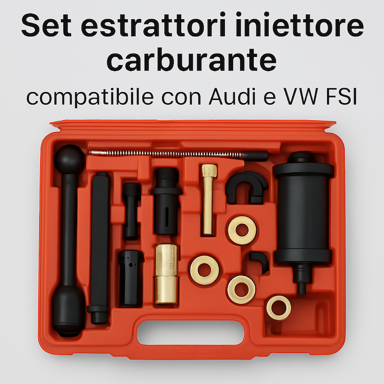 Set Estrattori Iniettori FSI – Kit Professionale per Veicoli Audi e VWStrumento indispensabile per la rimozione e installazione di iniettori benzina nei motori FSI di veicoli VW e Audi, garantendo un'estrazione rapida, efficace e sicura.🔧 Caratteristiche principali:Compatibile con motori FSI (1.4, 1.6, 1.8, 2.0, 2.7 V6, 3.0 V6, 3.2 V6, 3.6 V6, 4.2L V8)Acciaio al cromo-molibdeno e S45C – Elevata resistenza e durata nel tempoFinitura annerita chimicamente – Protezione contro usura e corrosioneAnelli zigrinati sugli adattatori – Massima presa anche in condizioni oleose⚙ Perfetto per professionisti:Ideale per la manutenzione degli iniettori su tutti i motori FSI VW-AudiAdatto anche alla maggior parte dei motori diesel✅ Affidabilità e precisione – Strumento di alta qualità progettato per officine e professionisti del settore automobilistico.