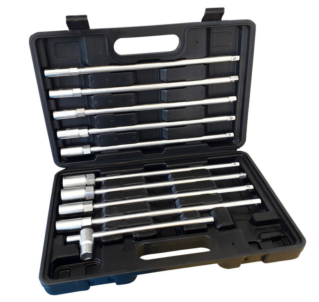 Set kit di chiavi 11 pz a T esagonali 9 bussole misura 8-19 mm prodotto soggetto a disponibilità del magazzino Set chiavi a bussola,chiavi a T con impugnatura extra lunga per un totale di 9 chiavi extra lunghe un manico a T per il loro utilizzo e un pratico astuccio riggido. La misura delle chiavi sono: 8 9 10 11 12 13 14 17 19 mm per una lunghezza di 29 cm circa Realizzato in acciaio di alta qualitàTemperatoFinitura satinata