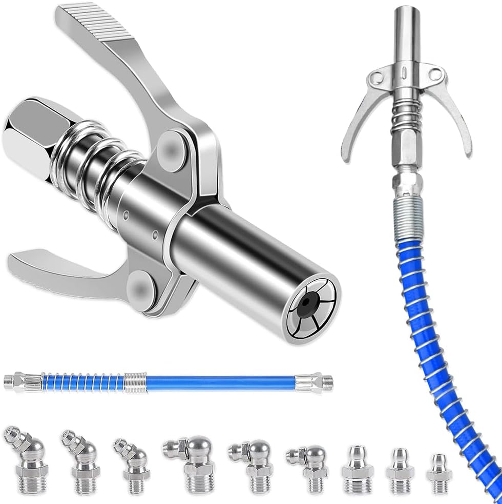 Materiale resistente e durevole: Ugello per pistola per grasso è realizzato in acciaio al carbonio di alta qualità, resistente alla corrosione, alla ruggine, ai graffi, con prestazioni stabili, non facile da rompere o piegare e con lunga durata e stabilità. Design a doppia impugnatura: il design a doppia impugnatura ha una funzione antiscivolo e offre presa e leva migliori. Il boccaglio per pistola per grasso può aiutarti a evitare una lubrificazione sporca, noiosa e inefficace e a prevenire gli sprechi aiutando a rimuovere lo sporco dal processo di lubrificazione. Ganasce rinforzate per migliorare la tenuta: l'adattatore per pistola per grasso utilizza un design della ganascia rinforzato per garantire prestazioni stabili a lungo termine. In combinazione con guarnizioni di alta qualità, non si verificano perdite nella parte anteriore o posteriore anche alla massima pressione. Il connettore G-coupling è a tenuta d'aria e di olio, facile da installare, efficace e sicuro da usare. Ampia gamma di applicazioni: adatto per alberi cardanici schermati, giunti di alberi, unità di raccolta, giunti a U e altri ugelli per grasso integrati, compatibile con tutti i grassi. Adatto per l'uso in cantieri edili, fattorie, foreste, miniere, officine di manutenzione e qualsiasi macchinario che necessiti di essere lubrificato. Ampia applicazione: riceverai 1 x accoppiatore per pistola per grasso, 1 x tubo per pistola per grasso, 1 x ago per pistola per grasso da 18 G. Se hai domande, contattaci immediatamente e risolveremo immediatamente il tuo problema.