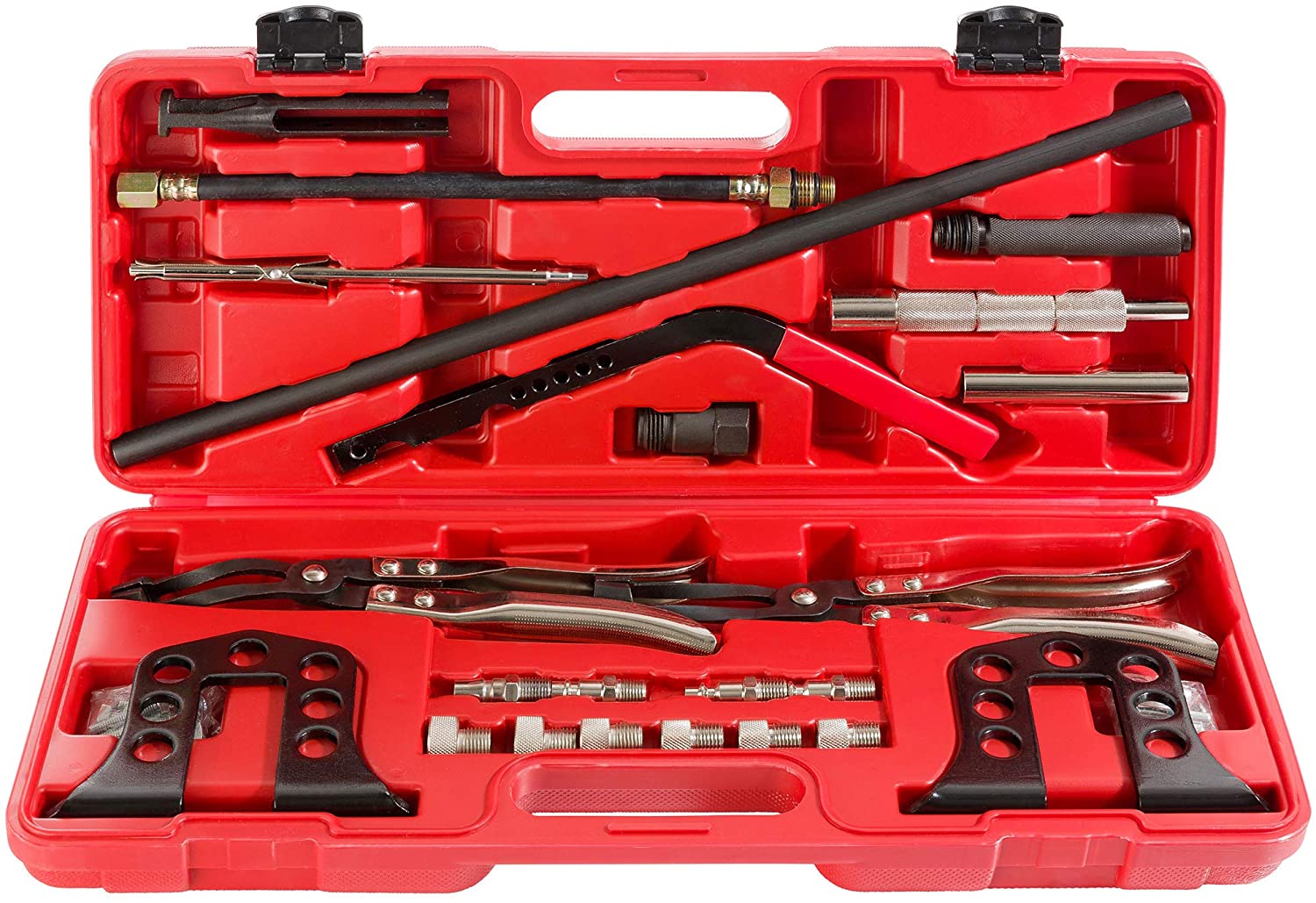 Set di attrezzi per la guarnizione dello stelo della valvola L'ampia gamma di strumenti è fornita in una pratica valigetta per il trasporto. Il processo completo di sostituzione delle guarnizioni dello stelo della valvola può essere effettuato dall'inizio alla fine con il contenuto di questa cassetta degli attrezzi. Per una descrizione dettagliata di questo processo, consulta le nostre istruzioni (lingua italiana non garantita).Grazie alle pinze in dotazione, è possibile rimuovere le guarnizioni della valvola in un batter d'occhio. Le impugnature magnetiche facilitano il montaggio e lo smontaggio dei cunei delle valvole. Inoltre, le scanalature sui punti di presa degli attrezzi garantiscono un comfort extra e una presa sicura durante l'utilizzo.Non cercate oltre: assicuratevi subito il vostro set completo!Contenuto della confezione:1 x connettore aria compressa M14 & M18 1 x tubo di pressione per candele di accensione M14 e M18 1 x adattatore per iniettori diesel M24 4 x raccordi per aria compressa per i più comuni sistemi ad aria compressa 1 x barra di collegamento (lunghezza 515 mm, diametro 15 mm) 2 x supporti a traverse per l'attacco dell'asta per la valvola a molla 1 x pezzo di pressione (diametro 22 mm, lunghezza 134 mm) 1 x leva di pressione per il serraggio delle molle della valvola con 5 fori di posizionamento 1 x strumento magnetico per il montaggio e lo smontaggio dei cunei della valvola (lunghezza 210 mm)Accessori inclusi:2 x pinze per guarnizioni dello stelo della valvola 1 x pinza dritta (lunghezza 270 mm) 1 x pinza angolata (lunghezza 270 mm) 6 x adattatori di montaggio con filettatura M16 (diametro: 5, 6, 7, 8, 10 e 11,4 mm) 1 x adattatore con diametro esterno di 19 mm, lunghezza 100 mm 1 x prolunga di registrazione da 130 mm per valvole profonde 1 x set di fissaggio (viti e dischi) 1 x valigetta in plastica