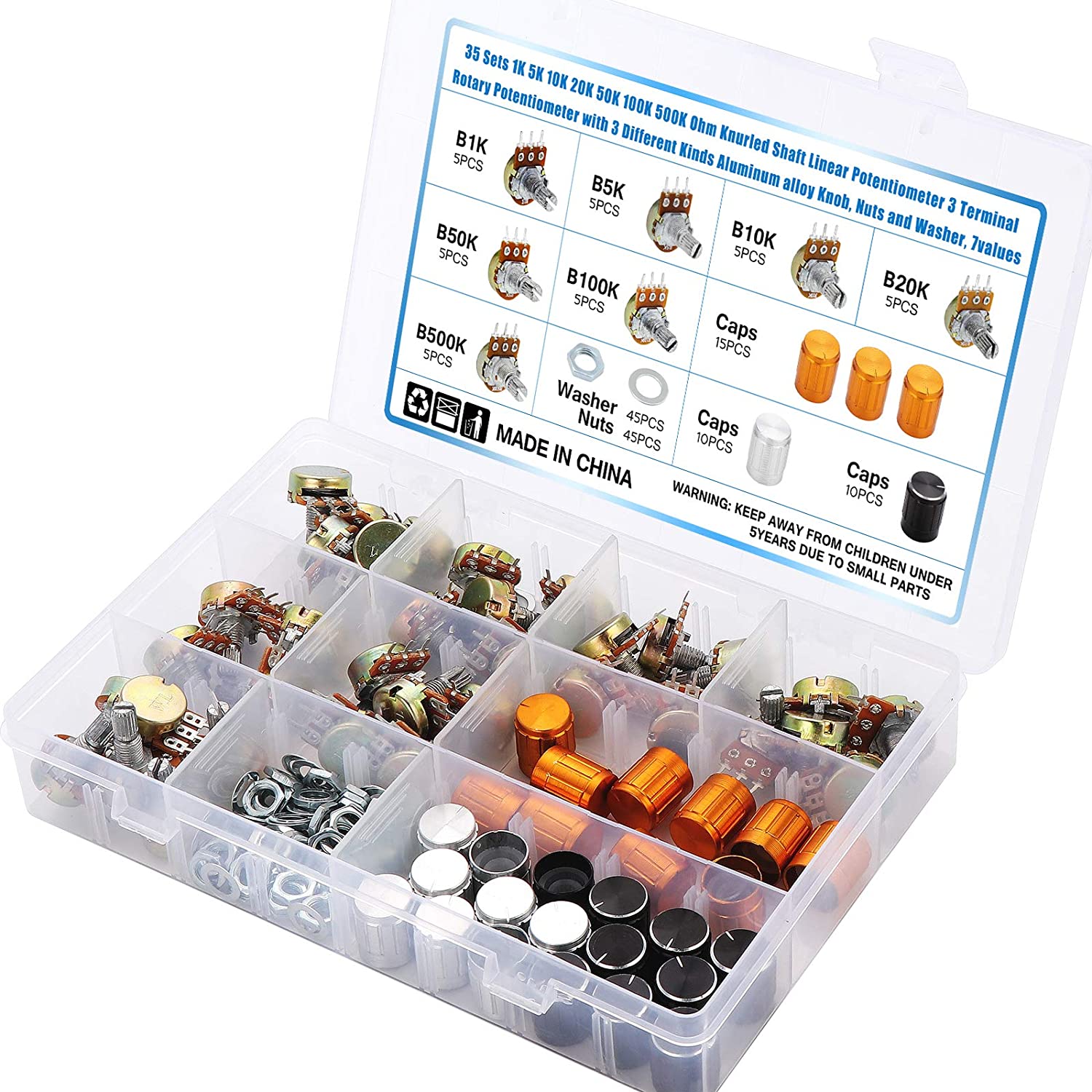 Set di 35 potenziometri per potenziometro lineare ad albero zigrinato, 7 valori, 3 potenziometro rotativo con manopole in lega di alluminio, dadi e rondella