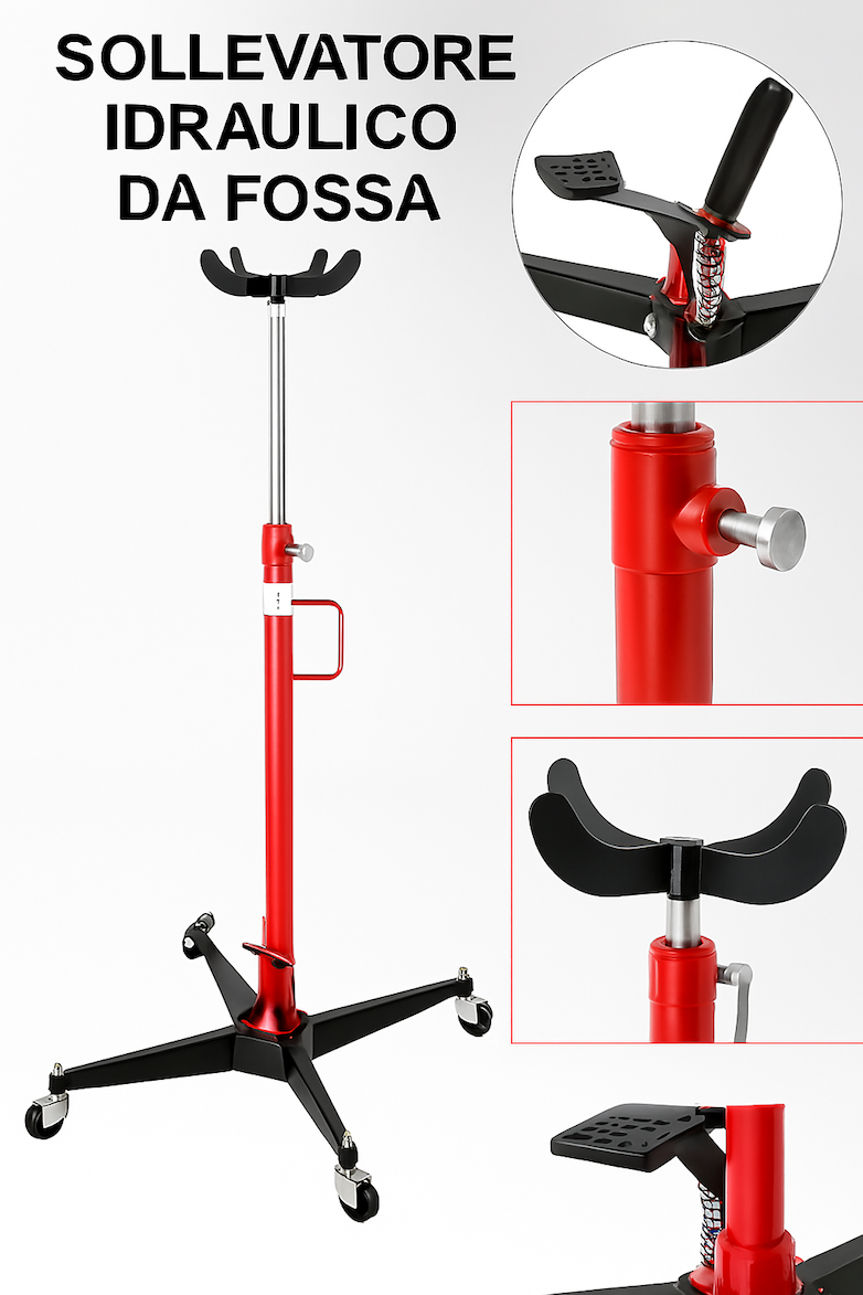 Sollevatore Idraulico da Fossa – Massima Precisione e Affidabilità per Officine🔧 Struttura robusta e facile da manovrare, ideale per manutenzione e riparazione sotto veicoli. ⚙ Pompa a pedale con valvola limitatrice di carico, garantisce sollevamenti sicuri e controllati. 🛠️ Adatto a diversi settori – Perfetto per officine professionali, automotive, agricoltura e linee di montaggio.Caratteristiche Tecniche✔ Azionamento: Idraulico ✔ Altezza di lavoro: Min 1000 mm – Max 1900 mm ✔ Presa a croce: ✔️ ✔ Carrello di atterraggio: 4 ruote girevoli in nylon per massima mobilità ✔ Materiale: Acciaio resistente ✔ Capacità max: 500 kg✔ Piatto di presa girevole: ✔️ ✔ Peso: 24,5 kg🚗 Perfetto per sollevare carichi fino a 500 kg e garantire massima sicurezza anche con il cilindro completamente esteso!⚠ Nota Bene: Il colore dell’articolo può variare, immagine indicativa del prodotto.